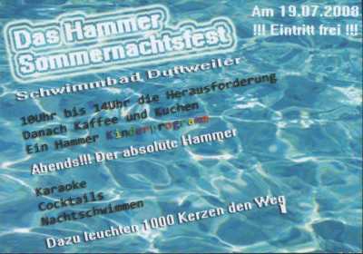 Ganz im Zeichen des Hammers steht auch das diesjährige Sommernachtsfest im Duttweiler Schwimmbad am kommenden Samstag, den 19. Juli. Um 14:00 Uhr wird bereits das SWR-Team ins Bad kommen und den Duttweilerern die sogenannte Herausforderung bekanntgeben. Der SWR ließ sich nur entlocken, dass eine Unterwasserkamera zum Einsatz kommen soll. Daraus schließen die Duttweilerer, dass die Aufgabe im Wasser gelöst werden soll. Wenn dies dann geschehen ist, wird der „SWR-Lukas“ gehauen. Als Belohnung winkt ein Tipp für die 24-Stunden-Aufgabe.